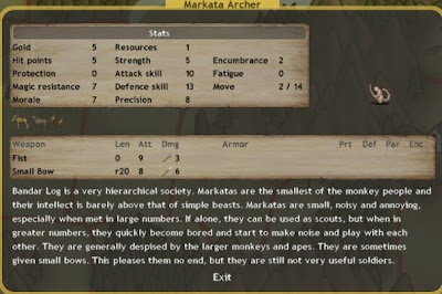 *Les mages de mes forts : les gorilles mages, les gorilles prêtres. On a de tout. Notez que la particularité de mes prêtres, c'est que TOUS les prêtres que j'ai (même ceux indépendants) peuvent réanimer des squelettes d'anciens singes. Ca fait pas très peur quand c'est des Markatas, mais il leur arrive de relever des Bandars... Ceci étant dit, passons à la suite.